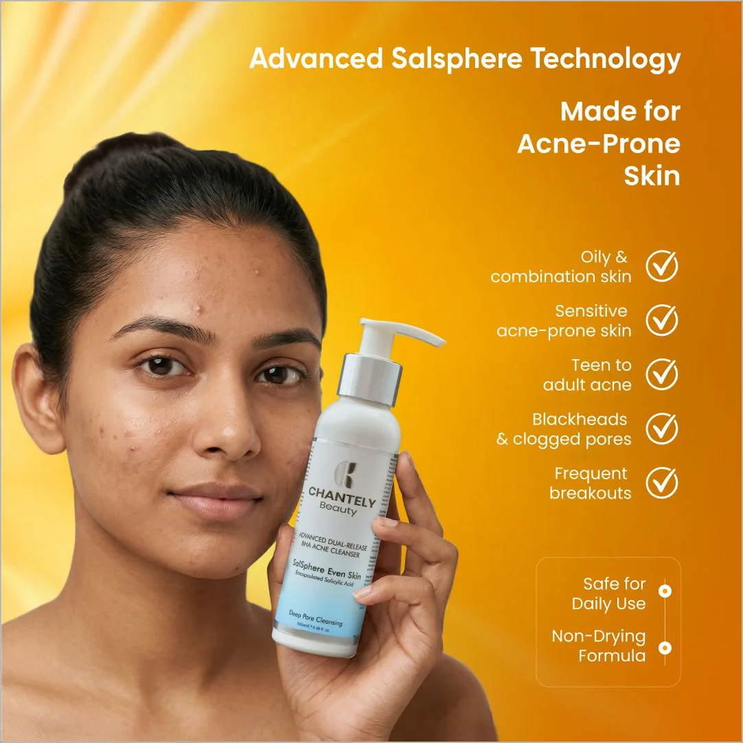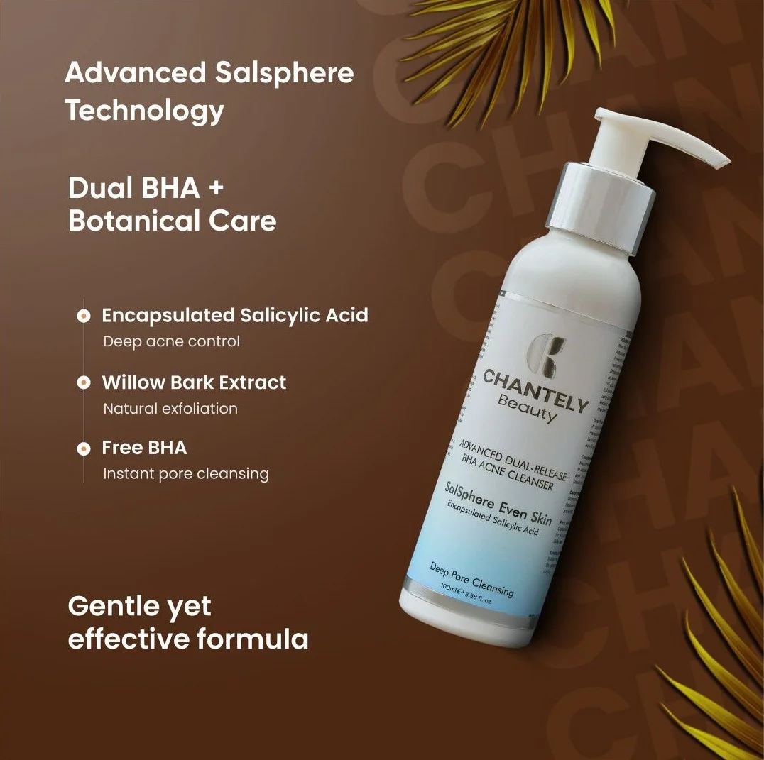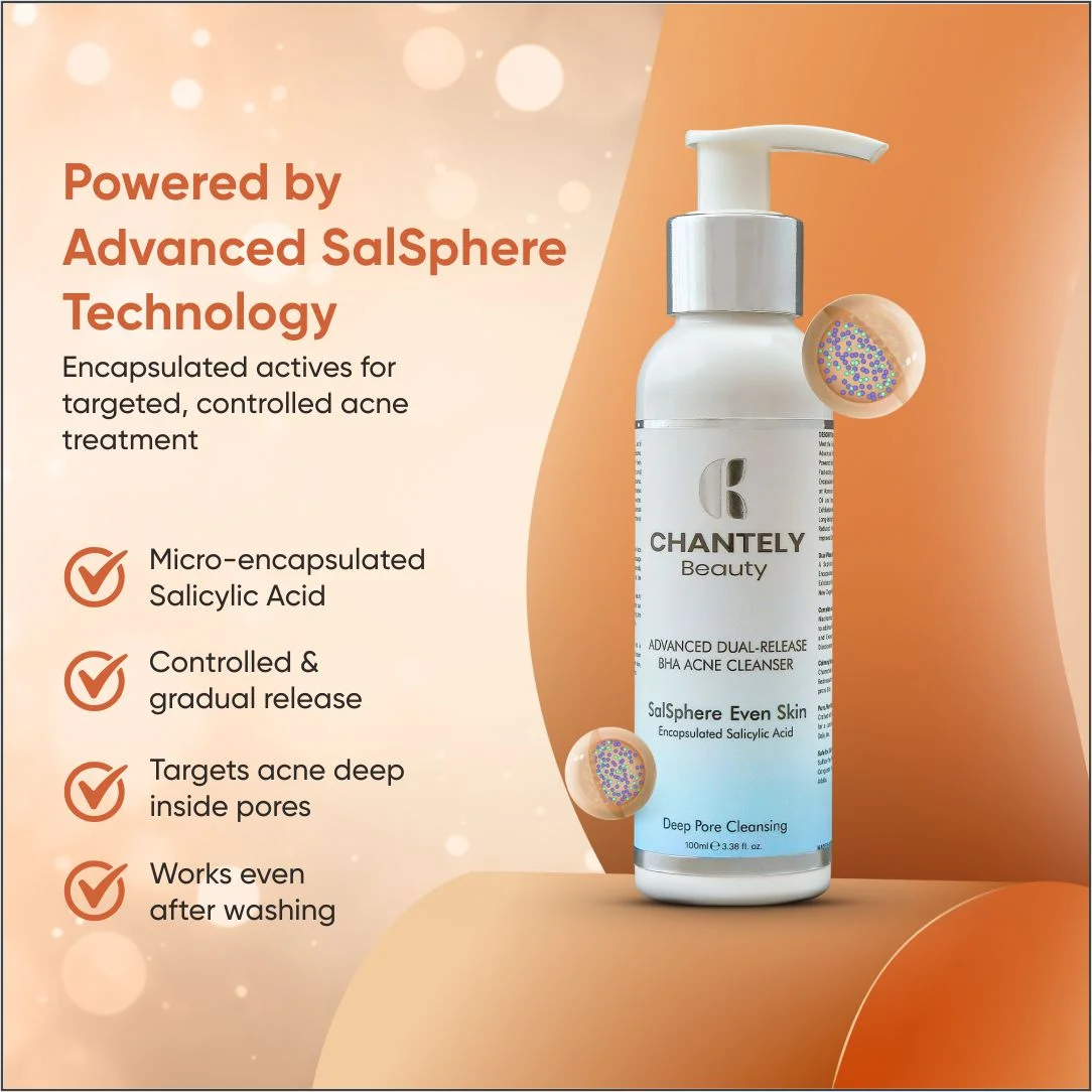 Meet the Future of Clear Skin with Our Chantely Beauty Advanced BHA Acne Cleanser : The First Cleanser Powered by BHA Dual Release System. We Combine 2% Fast-acting Salicylic Acid with 3% Innovative Salsphere Encapsulated BHA for a Revolutionary Two-phase Attack on Acne and Congestion. The Free BHA Targets Surface Oil and Impurities Instantly, While Our Time-Release Exfoliation with Salsphere Technology Ensures Controlled, Long-lasting BHA Delivery with Enhanced Efficacy and Reduced Irritation, Supporting a Healthy Skin pH and Improved Comfort.