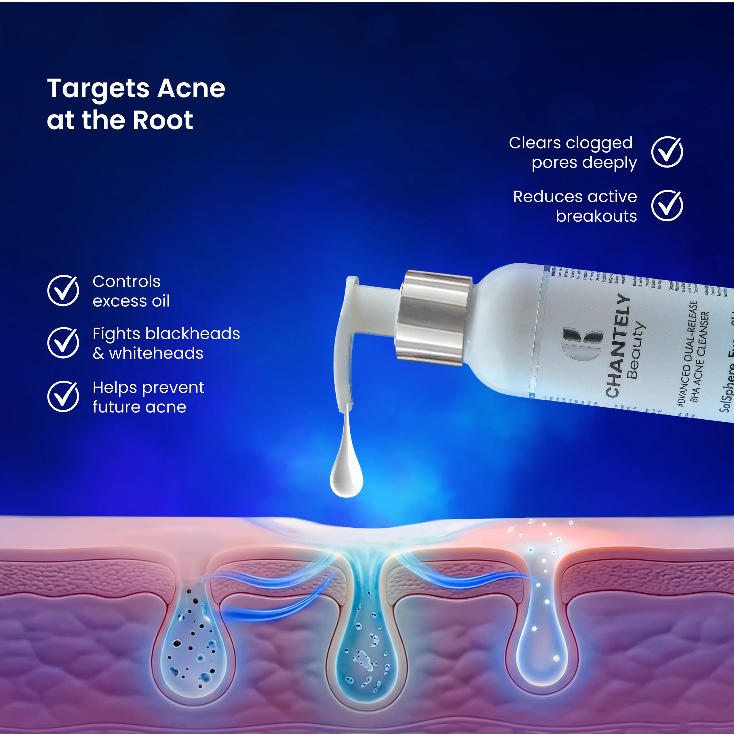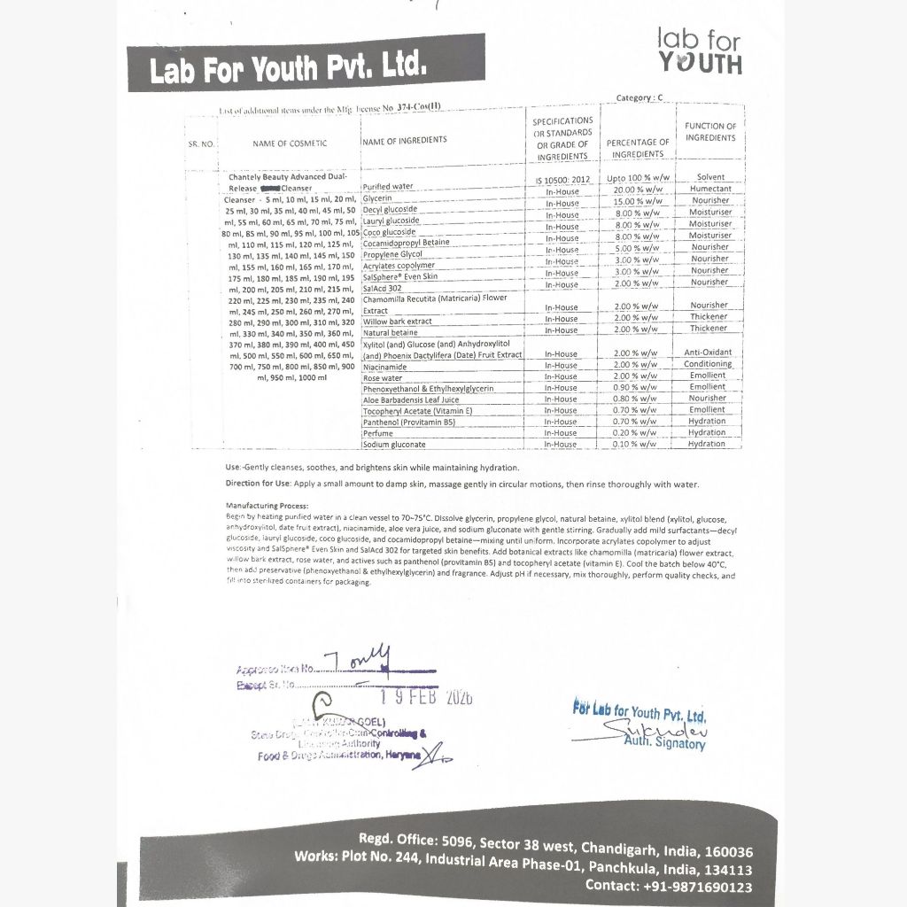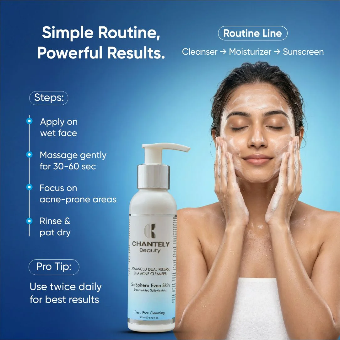 Meet the Future of Clear Skin with Our Chantely Beauty Advanced BHA Acne Cleanser : The First Cleanser Powered by BHA Dual Release System. We Combine 2% Fast-acting Salicylic Acid with 3% Innovative Salsphere Encapsulated BHA for a Revolutionary Two-phase Attack on Acne and Congestion. The Free BHA Targets Surface Oil and Impurities Instantly, While Our Time-Release Exfoliation with Salsphere Technology Ensures Controlled, Long-lasting BHA Delivery with Enhanced Efficacy and Reduced Irritation, Supporting a Healthy Skin pH and Improved Comfort.