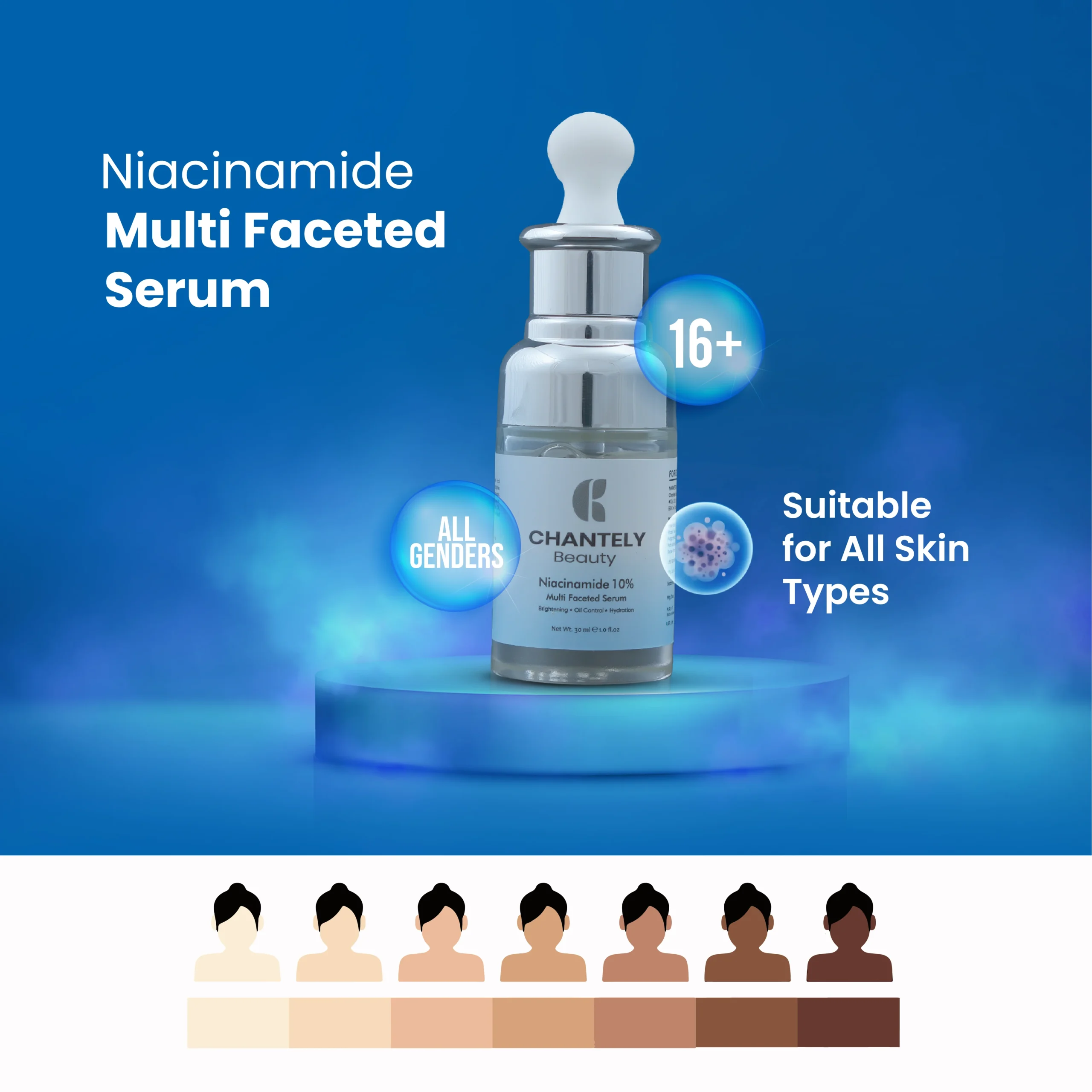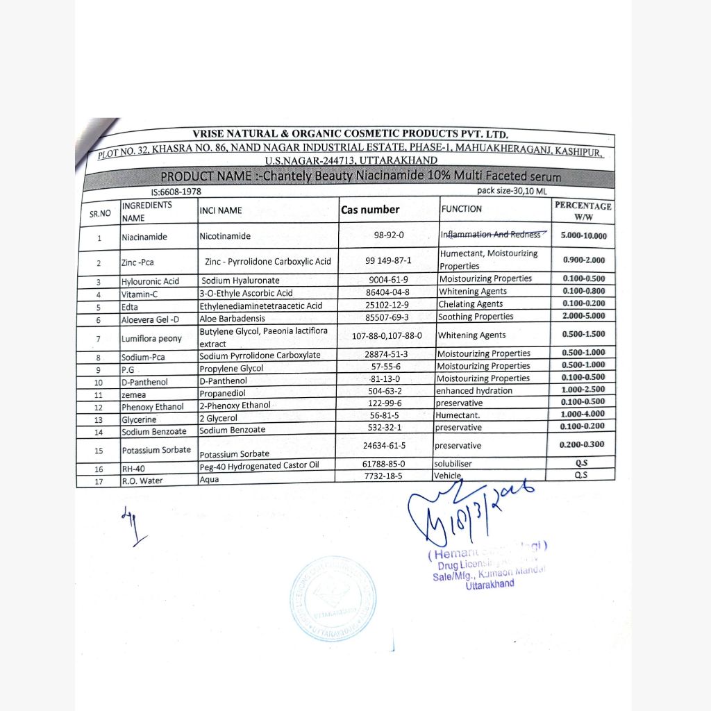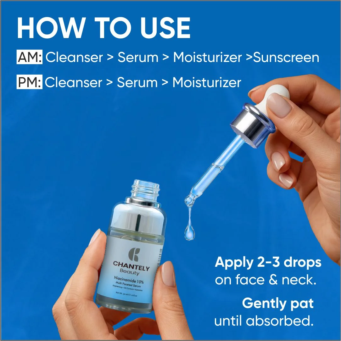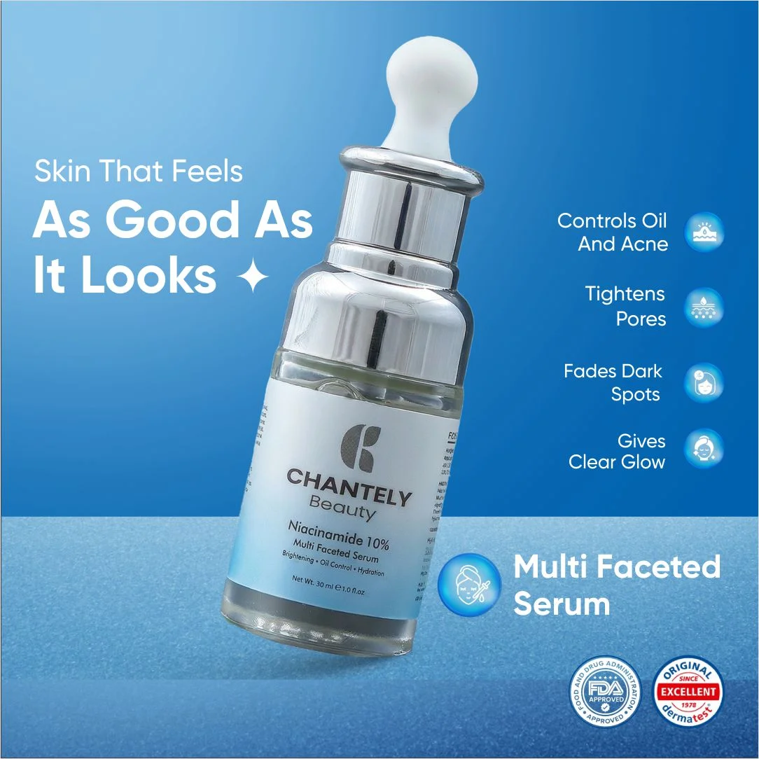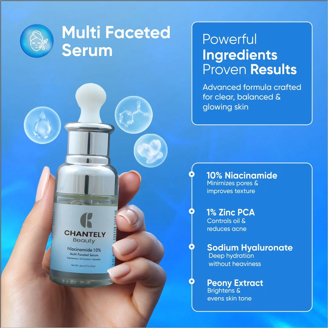 Chantely Beauty Niacinamide 10% is a Multi Faceted Serum Offering Potent Anti-Aging & Anti-Acne Benefits with Pore-Perfect Technology. This Clinically Effective Formulation, Formulated with 10% Niacinamide, Tightens the Skin, Brightens the Complexion and Shrinks Large and Open Pores. The Synergistic Addition of 1% Zinc PCA Provides Superior Sebum Regulation and Reduces Blemishes. It Promotes a Clearer, More Balanced and Youthful-looking Skin Tone. The Formula is further Enriched with Hyaluronic Acid for Plumping, Moisture Retention and Soothing Botanicals like Aloe Vera and D-panthenol (Pro-vitamin B5) to Ensure It is Effective Yet Gentle, Making it Suitable for All Skin Types, Specifically Oily, Combination, Sensitive and Acne Prone Skin.