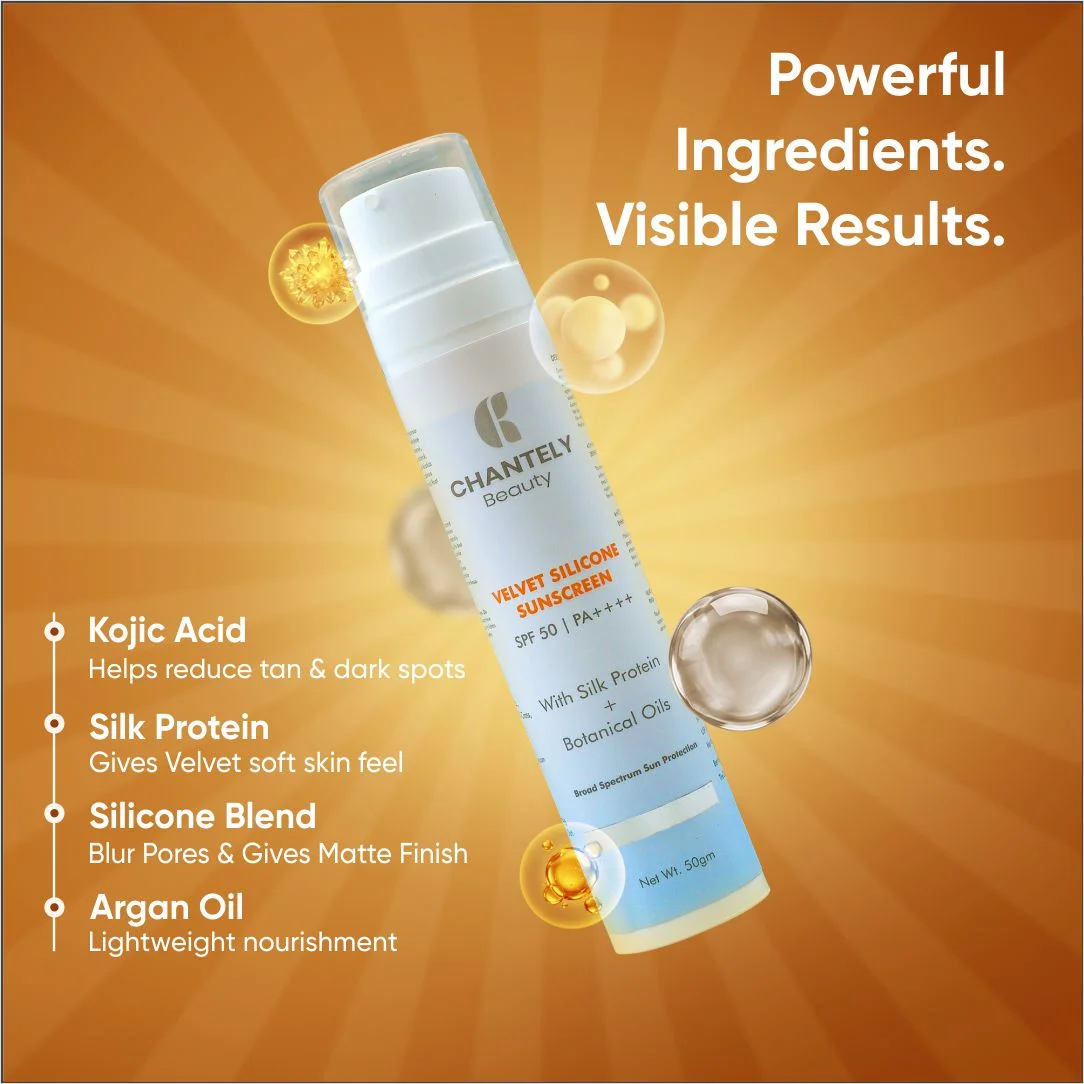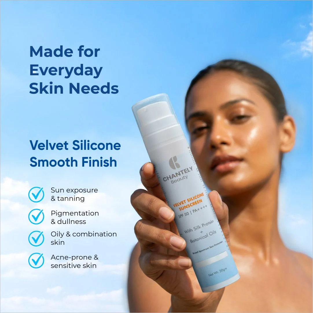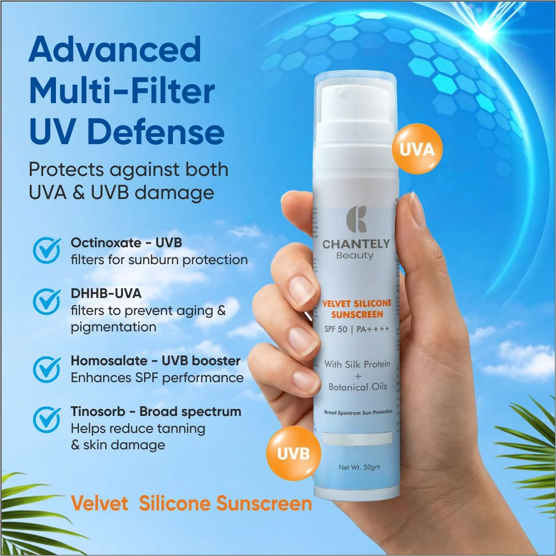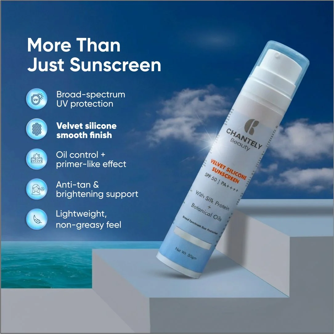 Chantely Beauty Velvet Silicone Sunscreen SPF 50 | PA++++ is a High-Performance, Broad Spectrum Sunscreen formulated to Deliver Very High Protection Against UVA and UVB rays while providing an Exceptionally Smooth, Velvety Skin Feel. The Advanced Silicone-Elastomer System ensures effortless spreadability, fast absorption, and a Lightweight, Breathable Protective Film with an Invisible, Non-greasy Finish and Zero White Cast.