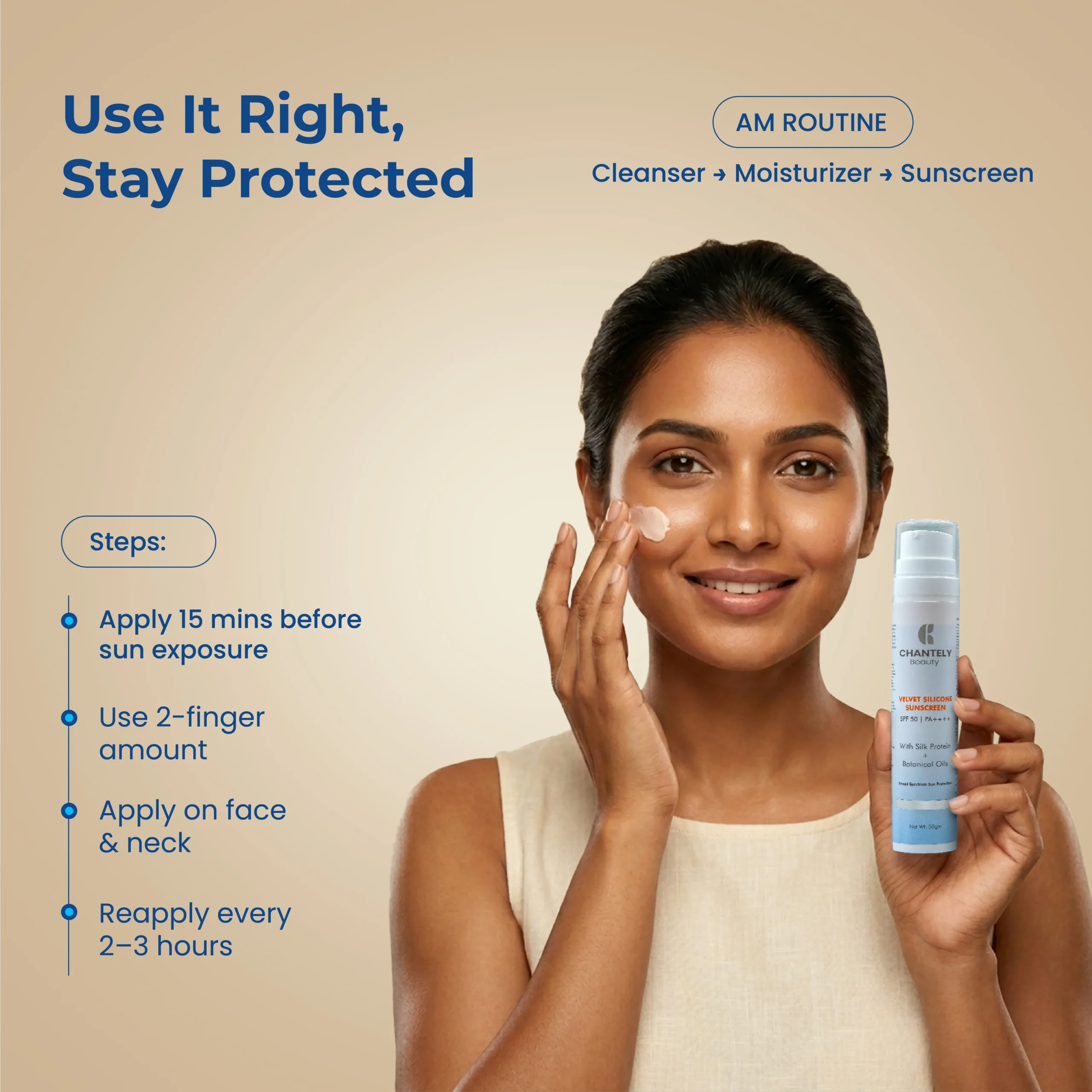• 04Use Chantely Beauty Velvet Silicon Sunscreen as the final step in your skincare routine.