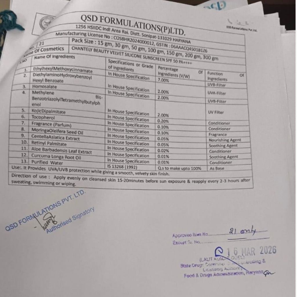 Chantely Beauty Velvet Silicone Sunscreen SPF 50 | PA++++ is a High-Performance, Broad-Spectrum SPF 50 | PA++++ Sunscreen Formulated with Photostable UV Filters and An Advanced Silicone Elastomer System to Provide Very High UVA/UVB Protection with a Lightweight, Breathable, Velvet-matte Finish.